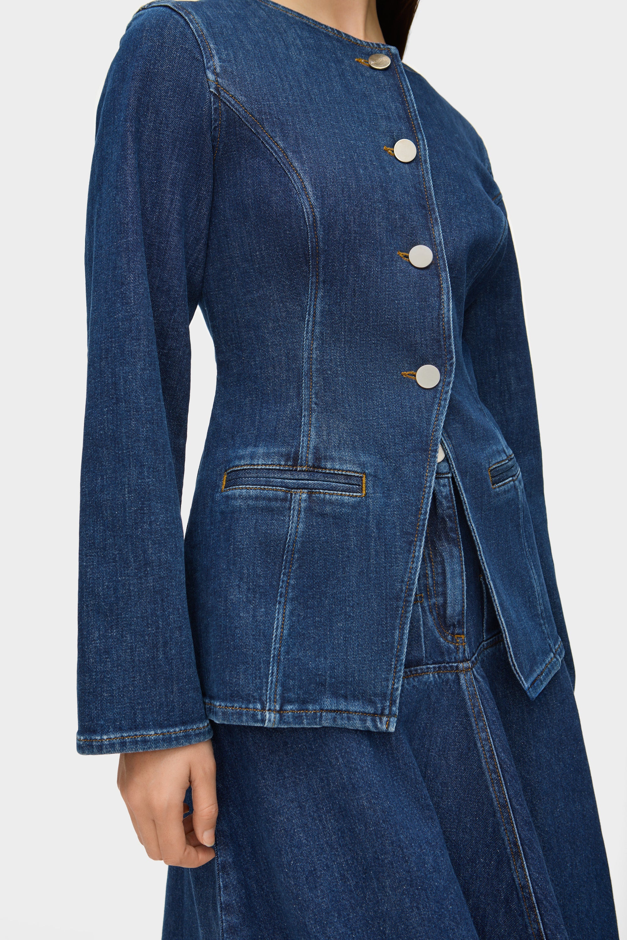 - The bestselling fitted blazer in denim, designed with a waist split and perfect for high-waisted bottoms