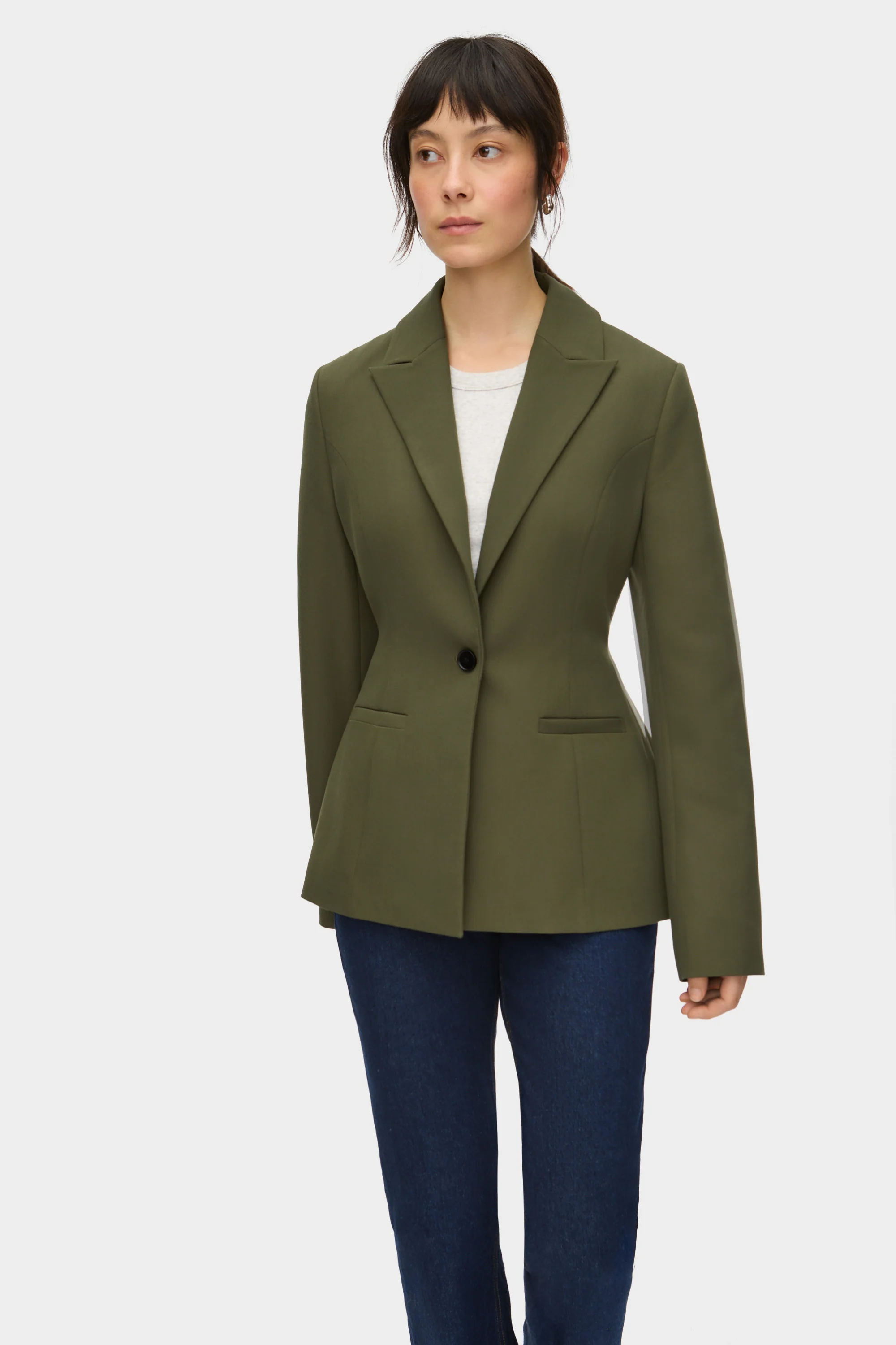 V-neck, peaked-lapel long waisted blazer