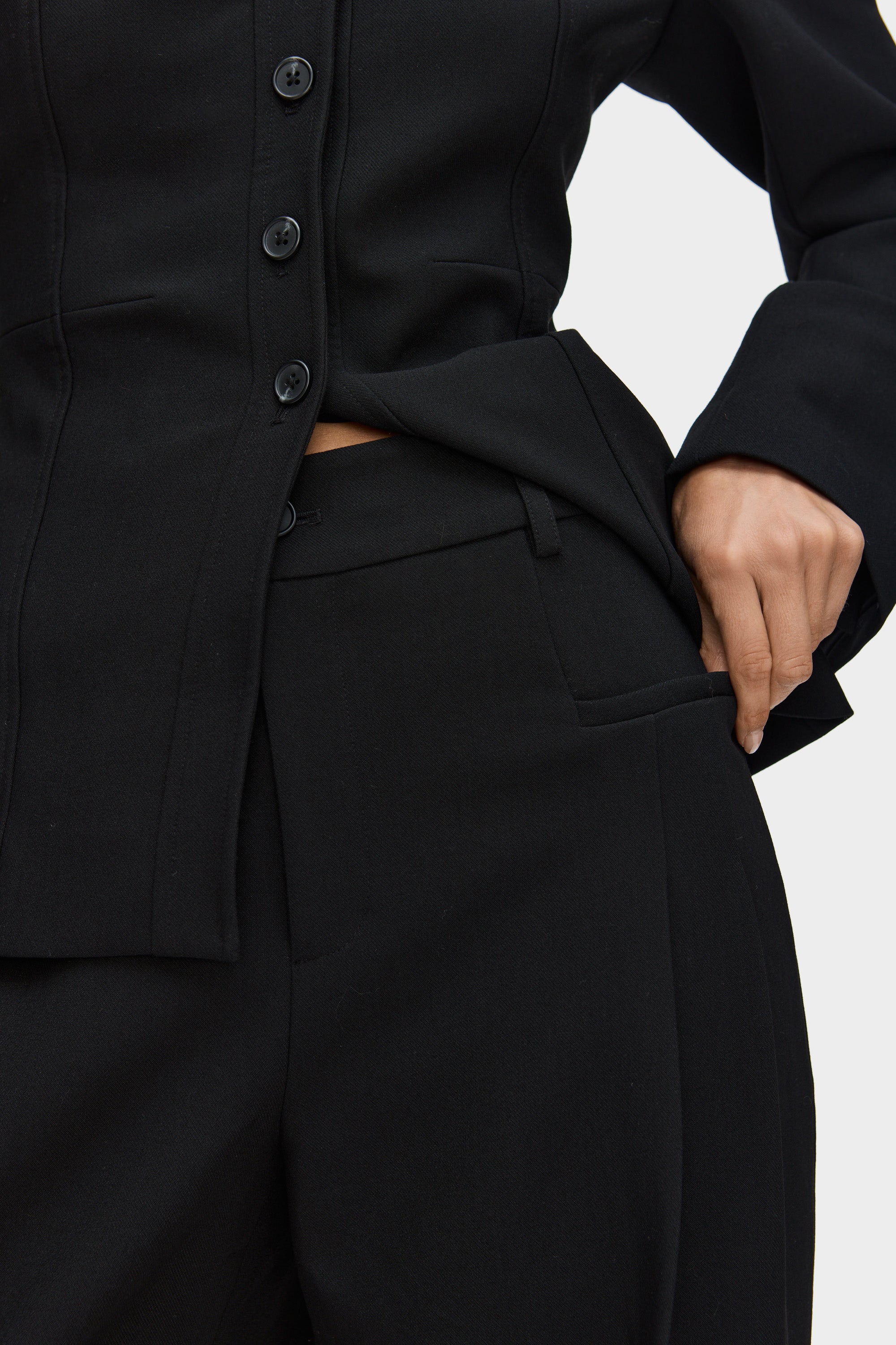 - Wide-leg tailored trousers with modern pleat detailing at the front and back