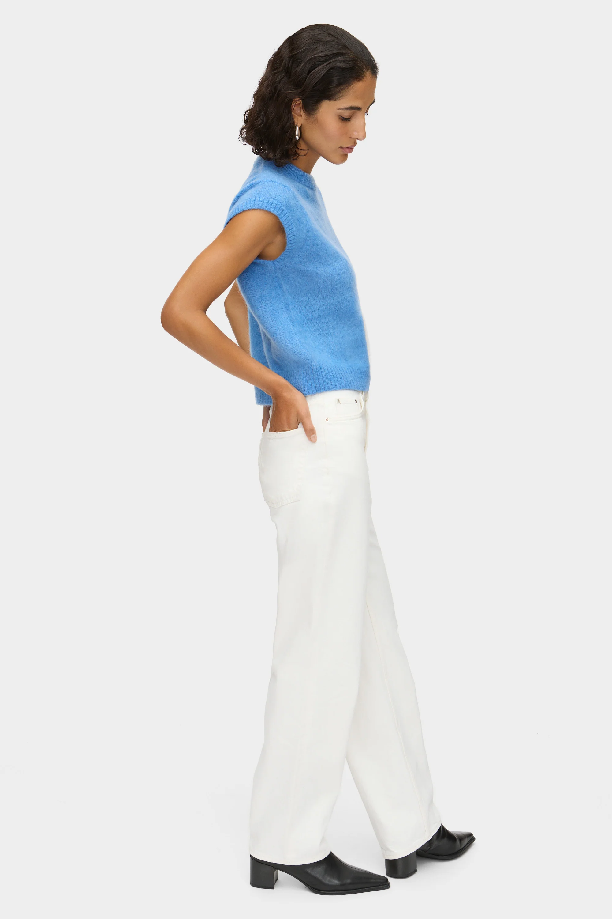 Soft mohair knit top in cornflower blue, featuring cap sleeves and ribbed detailing